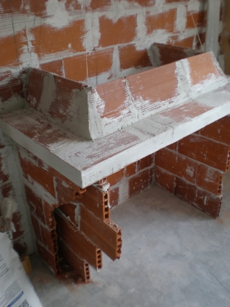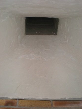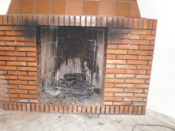 Hotte en briques enduites au plâtre et foyer en briquettes.